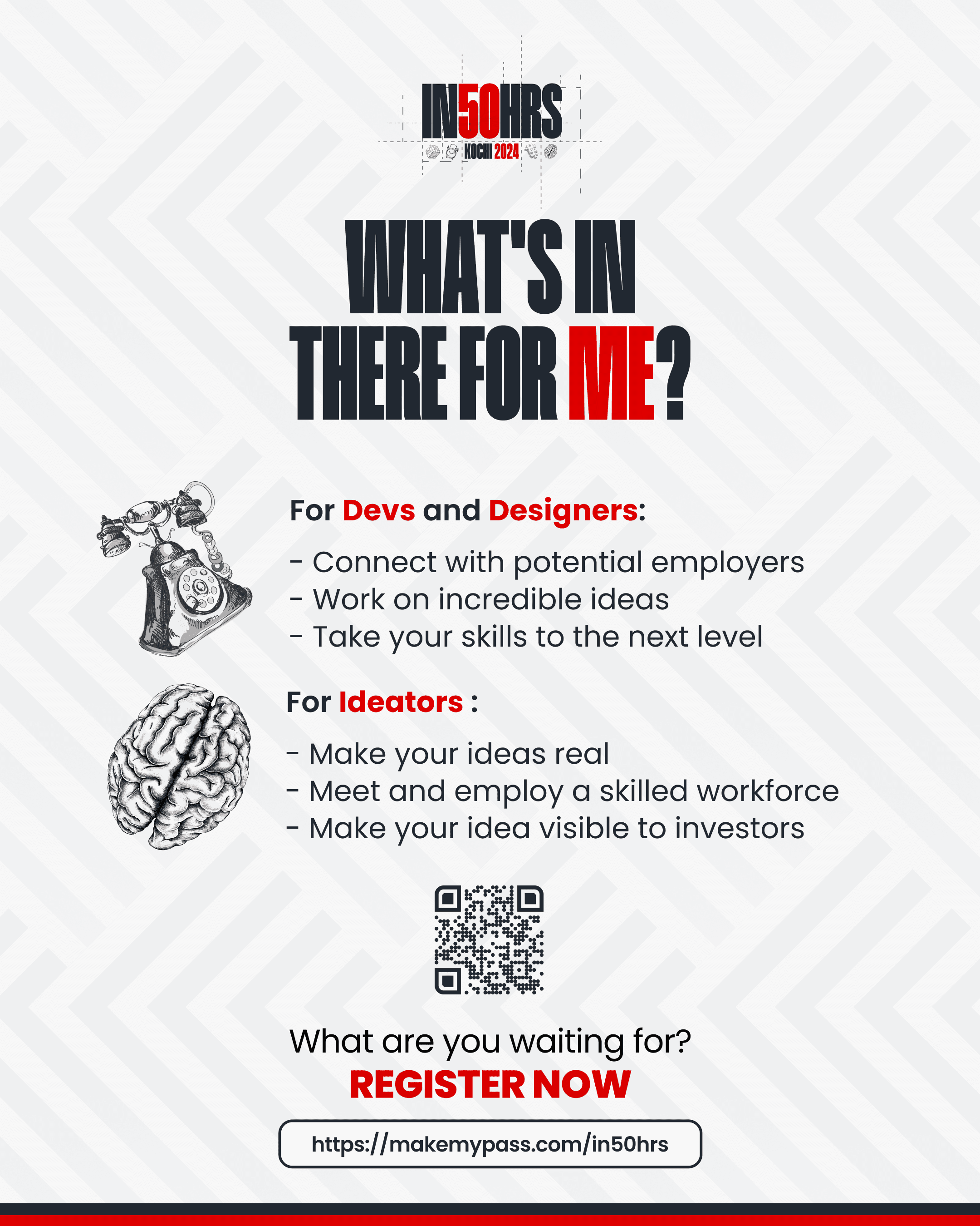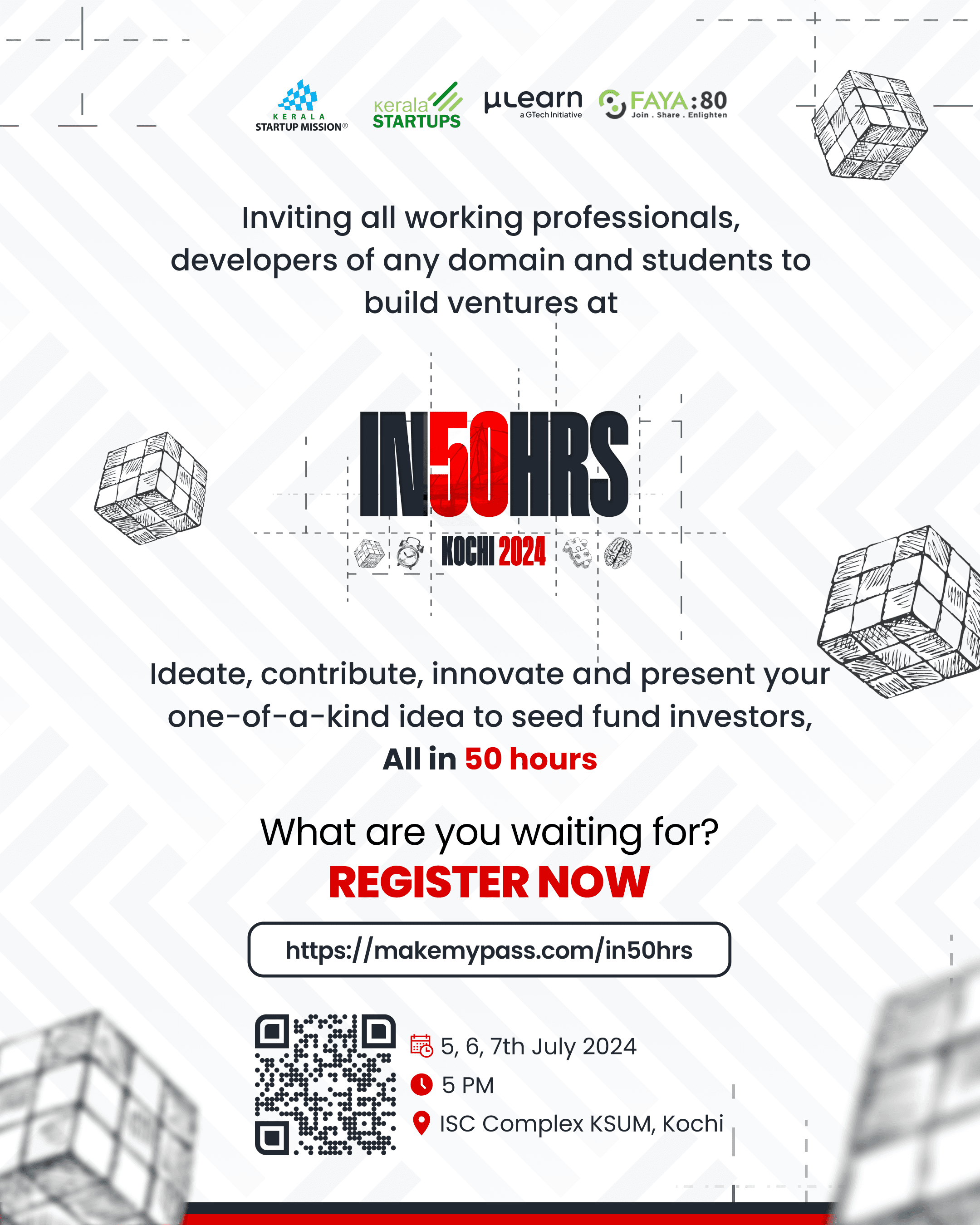 In50Hrs is a high-intensity, 50-hour hackathon designed for professionals — a prototyping event where ideas are transformed into reality. It invites passionate ideators to pitch their innovative concepts, form teams with like-minded designers and developers, and build working prototypes within a focused 50-hour sprint. The event culminates in an exclusive showcase, offering participants a rare opportunity to present their solutions to investors and unlock their full potential.